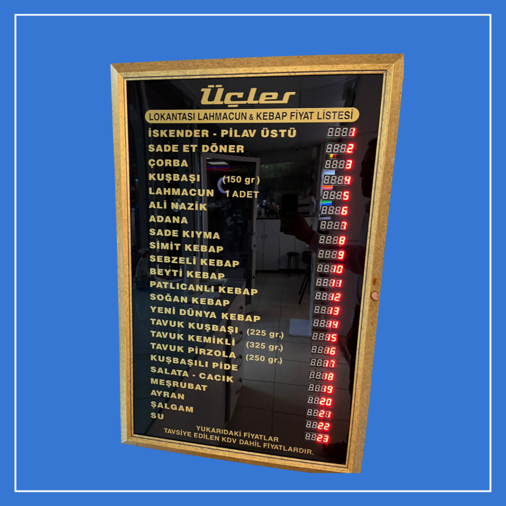- Uzaktan Kontrol: İleri teknoloji sayesinde, fiyat panosu uzaktan kontrol edilebilir. Bu, işletme sahiplerinin fiyatları merkezi bir noktadan güncelleyebilmesine olanak tanır.